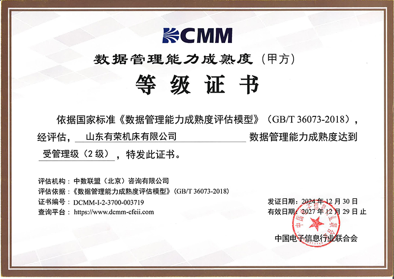 山东有荣机床荣获DCMM数据管理能力成熟度等级证书